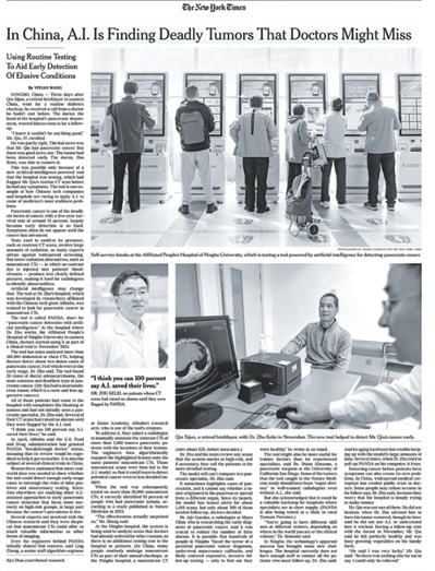这是《纽约时报》2026年首篇关于中国的报道。该报记者来到宁波一家医院,实地采访了57岁的退休泥瓦匠邱先生。他去医院查糖尿病,却接到电话,说AI在他的平扫CT片里发现了胰腺癌。万幸的是,他的胰腺癌还在早期,顺利做了手术切除。