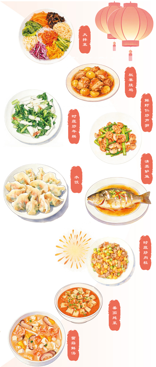 年夜饭不仅要丰盛、美味,还要注重营养与健康。以6—8人的家庭为例,王志翊给出了以下建议——