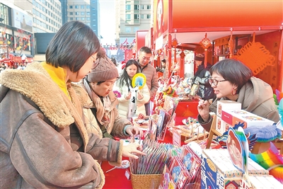 “天下相亲与相爱,动身千里外心自成一脉……”随着音乐在广场响起,数名演员登上新春市集的“舞台”,与现场的观众互动。“今年的市集主打‘福’文化,打造多元游乐场景,覆盖市民游客新春采购、体验、游玩等多样需求,让市民游客在这里开开心心、欢欢乐乐过好年。”北京新隆福文化投资有限公司总经理助理高天亮说。