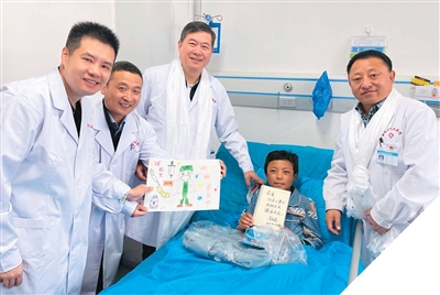 2023年8月,董家鸿院士(左三)在青海省果洛藏族自治州人民医院为患儿拉吾实施肝包虫病手术后查房。 |