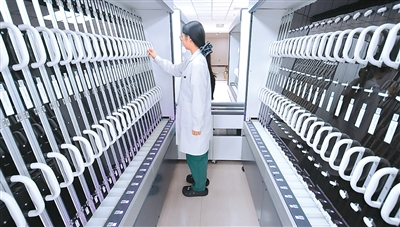 北京安贞医院通州院区药房的工作人员在巡查注射液分配机器人系统。 |