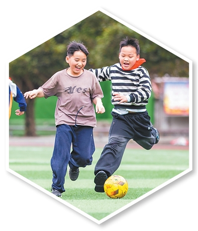 贵州省从江县刚边壮族乡中心小学学生在体育课上踢足球。 |